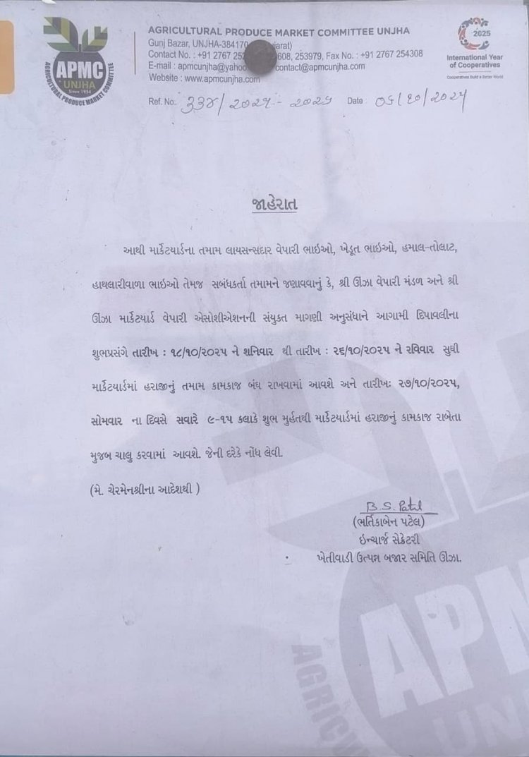 ખેતીવાડી ઉત્પન્ન બજાર સમિતિ ઊંઝા દ્વારા જણાવવામાં આવ્યું છે કે, આથી માર્કેટયાર્ડના તમામ લાયસન્સદાર વેપારી ભાઇઓ, ખેડૂત ભાઈઓ, હમાલ-તોલાટ, હાથલારીવાળા ભાઈઓ તેમજ સબંધકર્તા તમામને જણાવવાનું કે, ઊંઝા વેપારી મંડળ અને શ્રી ઊંઝા માર્કેટયાર્ડ વેપારી એસોશીએશનની સંયુક્ત માગણી અનુસંધાને આગામી દિપાવલીના શુભપ્રસંગે તારીખ : ૧૮/૧૦/૨૦૨૫ ને શનિવાર થી તારીખ : ૨૬/૧૦/૨૦૨૫ ને રવિવાર સુધી માર્કેટયાર્ડમાં હરાજીનું તમામ કામકાજ બંધ રાખવામાં આવશે અને તારીખઃ ૨૭/૧૦/૨૦૨૫, સોમવાર ના દિવસે સવારે ૯-૧૫ કલાકે શુભ મુર્હતથી માર્કેટયાર્ડમાં હરાજીનું કામકાજ રાબેતા મુજબ ચાલુ કરવામાં આવશે. જેની દરેકે નોંધ લેવી.